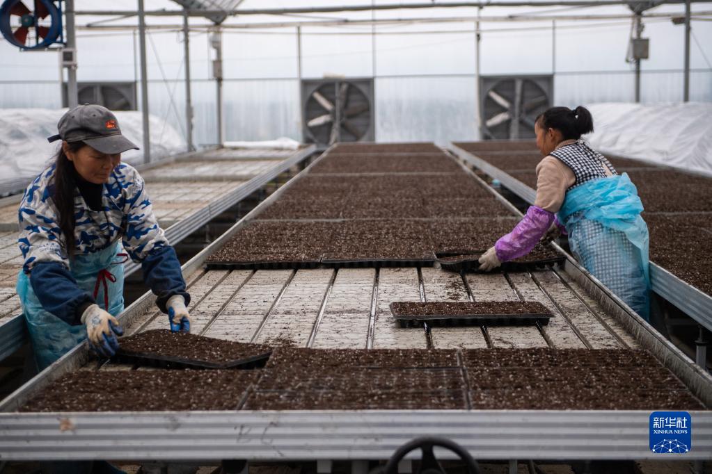 2月8日,在鼎城區國家現代農業(yè)產(chǎn)業(yè)園一處蔬菜育苗基地,工作人員在擺放蔬菜育苗盤(pán)。