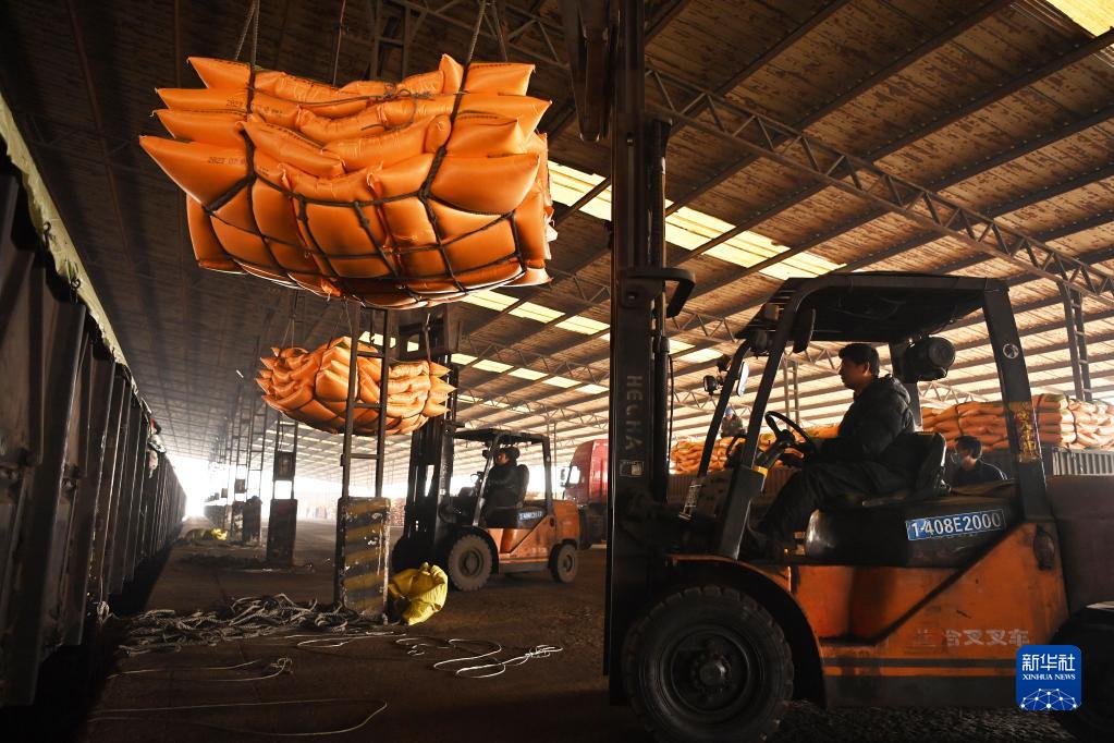 2月8日,在中國鐵路太原局集團有限公司稷山站,工作人員在裝運化肥。