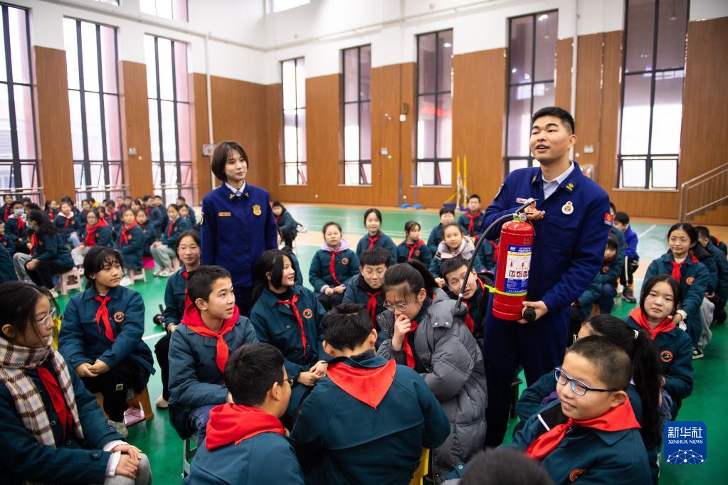 2月8日,在常德市武陵區第一小學(xué)體育館,消防隊員指導學(xué)生使用滅火器。