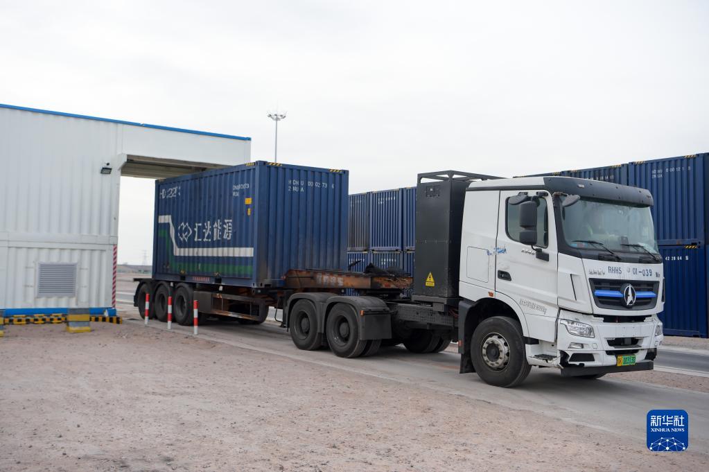 2月8日,在鄂爾多斯市東勝區綠動(dòng)萬(wàn)利新能源智慧陸港,新能源重卡換電后駛出充換電站。
