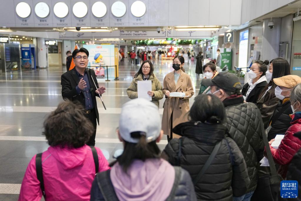 2月8日,在北京首都國際機場(chǎng)2號航站樓,中青旅遨游網(wǎng)領(lǐng)隊為前往泰國旅游的游客講解出行安排。