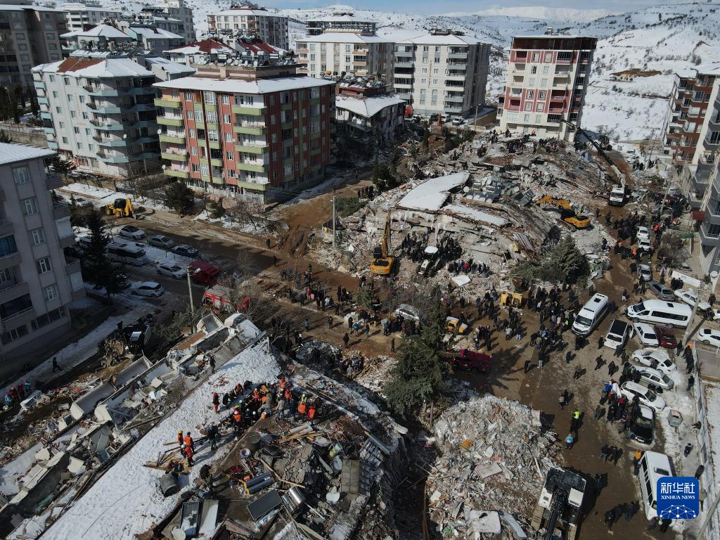 2月8日,在土耳其阿德亞曼省貝斯尼,救援人員在地震廢墟搜救(無(wú)人機照片)。