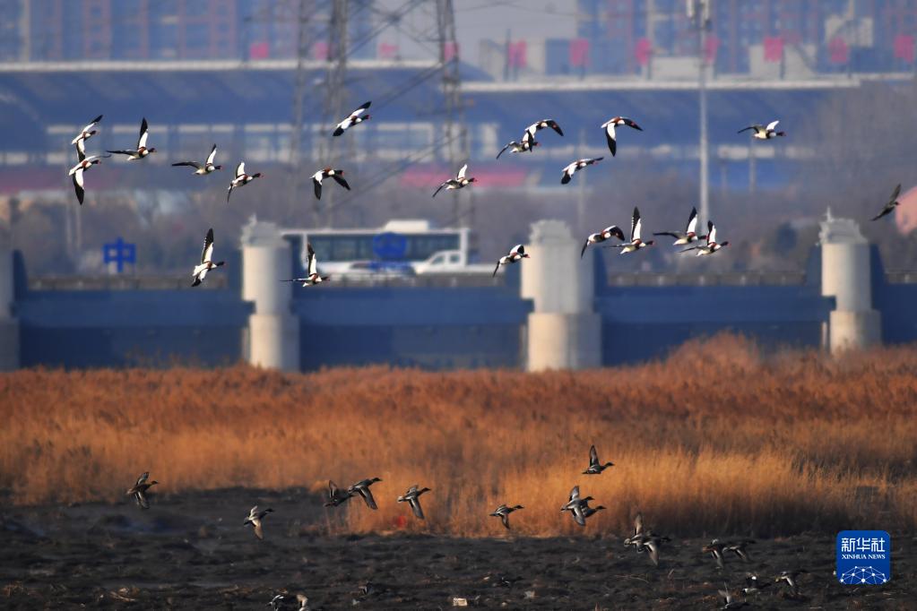 2月8日,在山東省青島市城陽(yáng)區流亭街道墨水河入??跐竦?,成群水鳥(niǎo)翩躚飛翔。