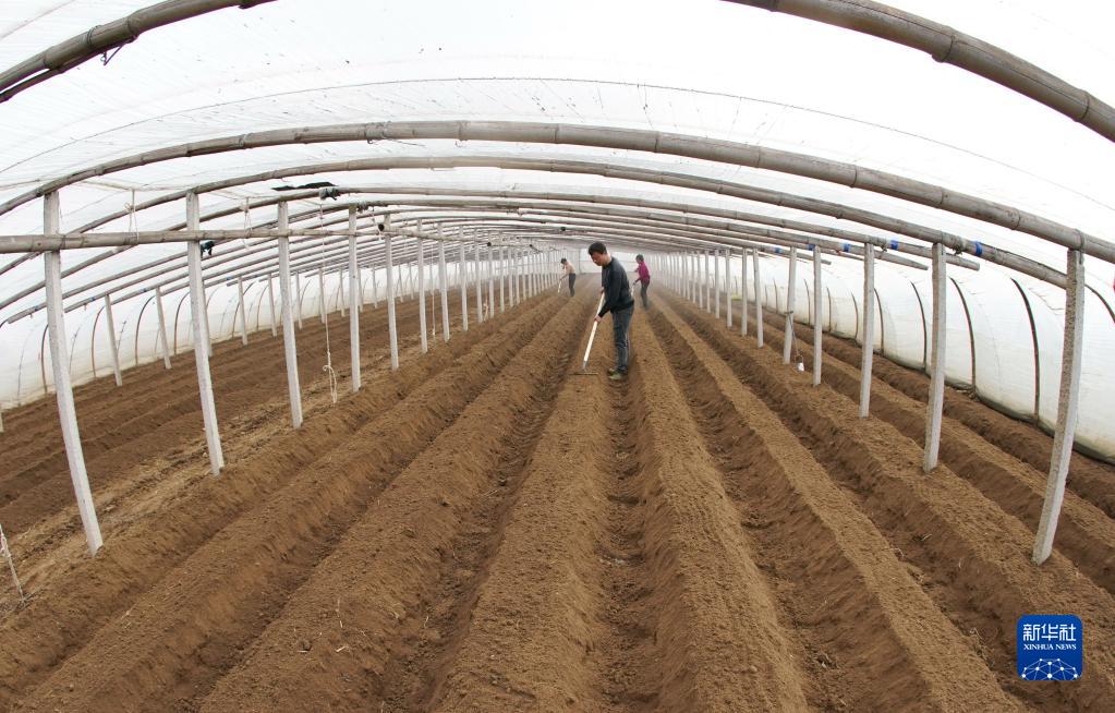 2月8日,河北省秦皇島市昌黎縣馬坨店鄉東趙莊村的農民在大棚內平整馬鈴薯壟。