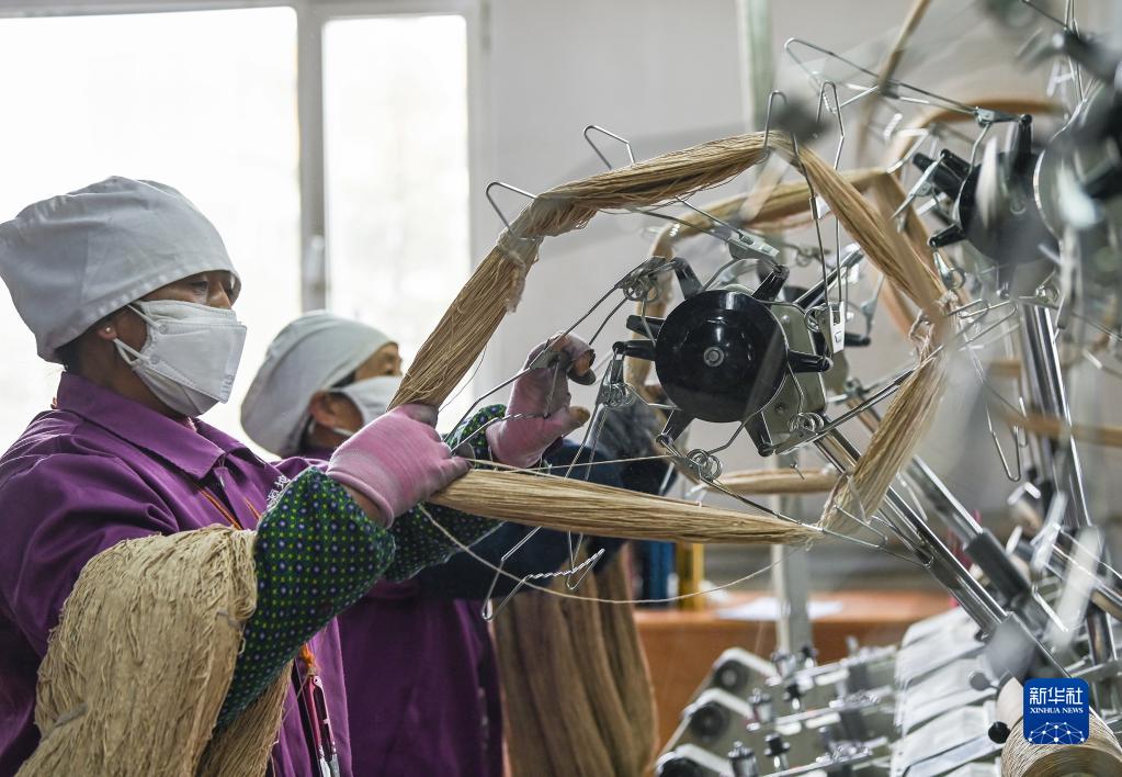 女工們在圣源地毯集團有限公司生產(chǎn)車(chē)間絡(luò )筒(2月1日攝)。