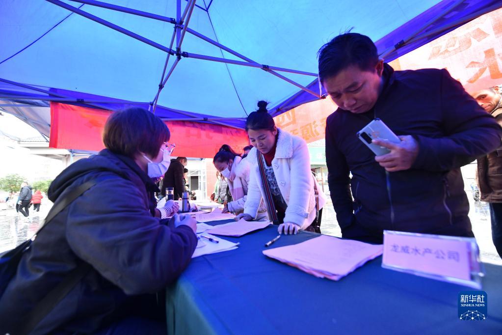 2月9日,在廣西融水苗族自治縣易地扶貧安置點(diǎn)苗美家園社區,求職者和招聘人員在交流。