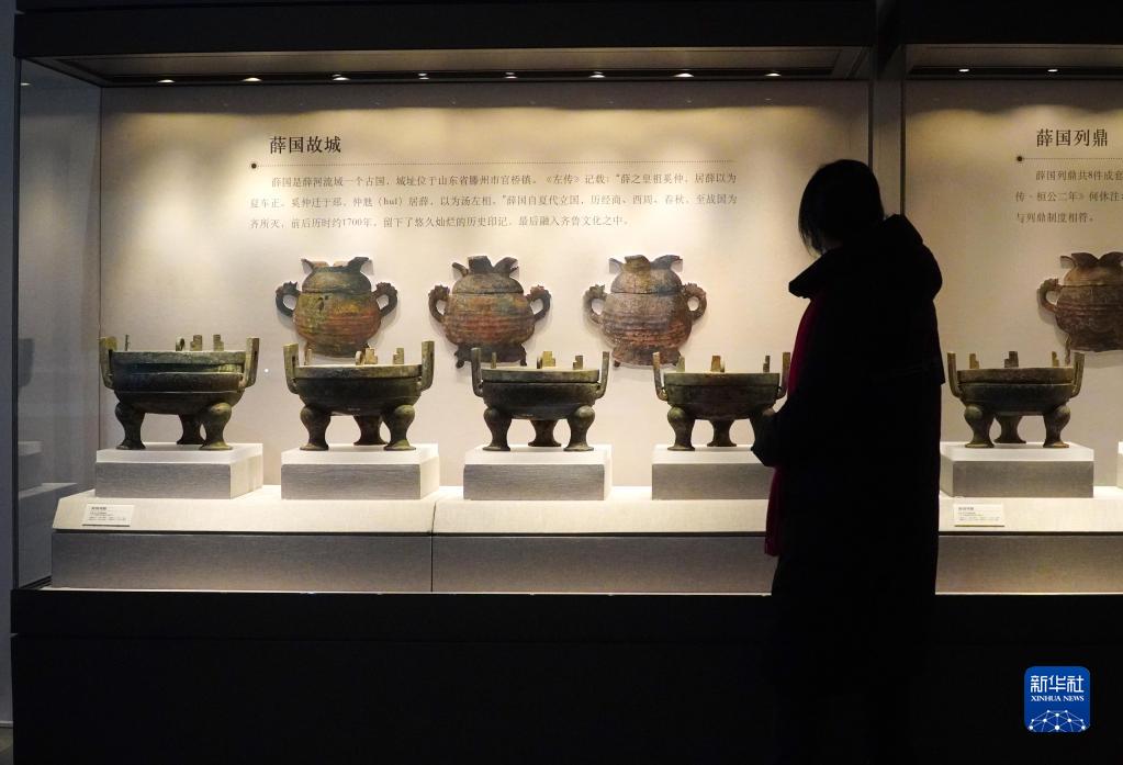 2月9日,在孔子博物館舉行的山東文物精品展上,參觀(guān)者在觀(guān)看濟寧市博物館收藏的春秋薛國列鼎。