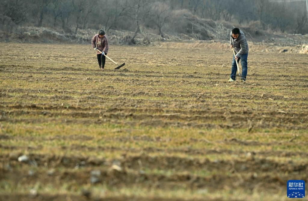 2月8日,農民在河北省石家莊市贊皇縣呂莊村麥田進(jìn)行田間管理。