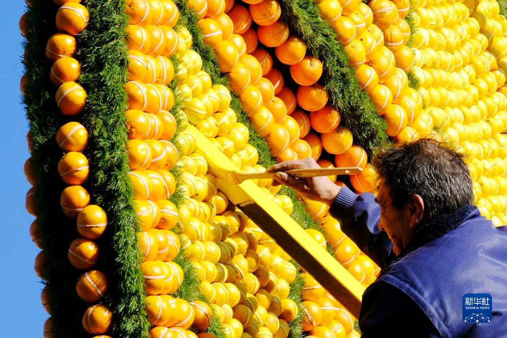 2月9日,在法國南部小城芒通,工作人員為檸檬節做最后準備。