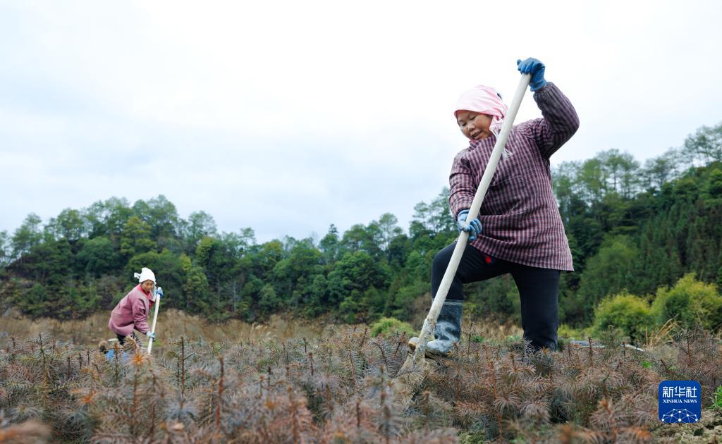 2月9日,農民在湖南省懷化市通道侗族自治縣菁蕪洲鎮江口村杉樹(shù)育苗基地挖樹(shù)苗。