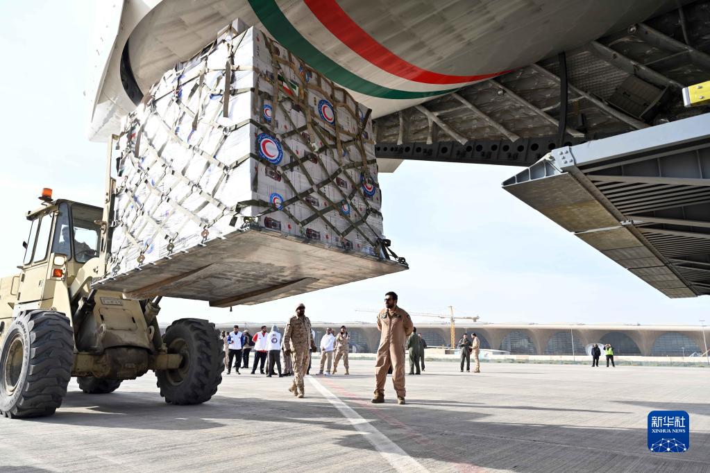2月9日,工作人員在科威特費爾瓦尼耶省的科威特國際機場(chǎng)裝載人道主義援助物資。