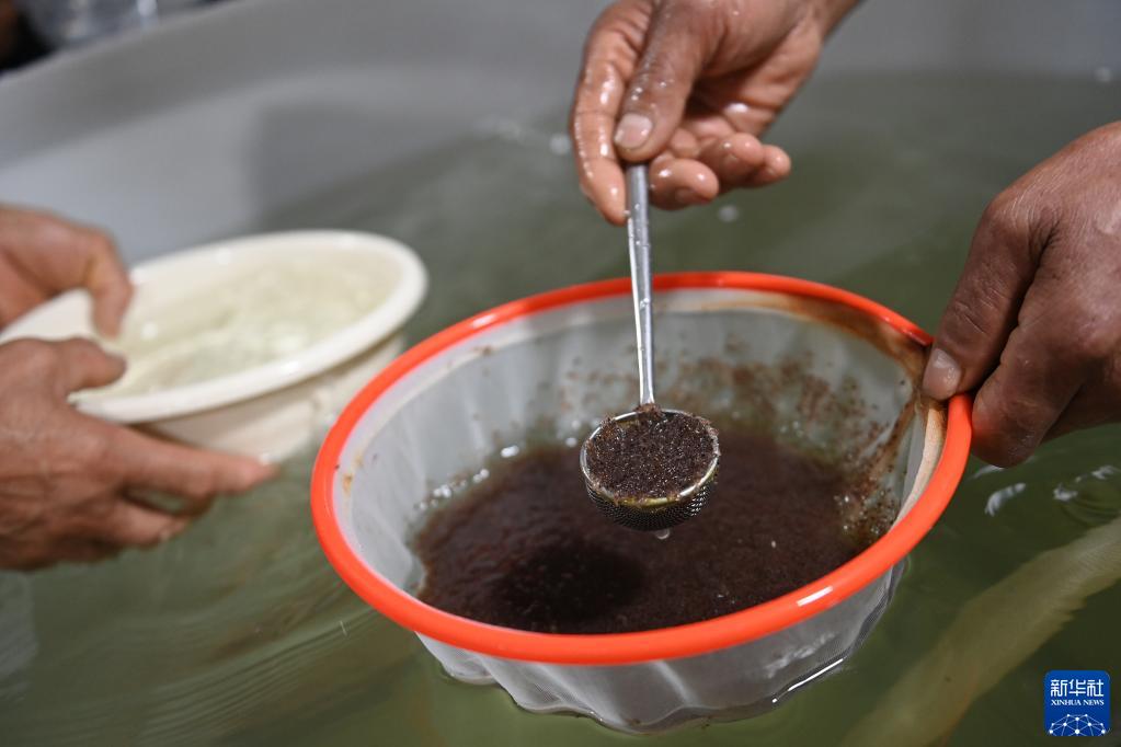 2月10日,工人在包裝車(chē)間將蝦苗定量分揀。