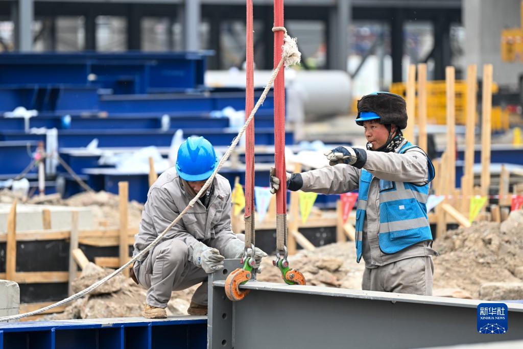 2月9日,建設者在天津南港乙烯項目建設施工現場(chǎng)指揮起重機吊裝鋼梁。