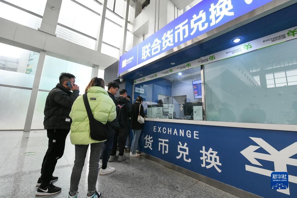 2月10日,在成都雙流國際機場(chǎng)T1航站樓,旅客排隊兌換外幣。