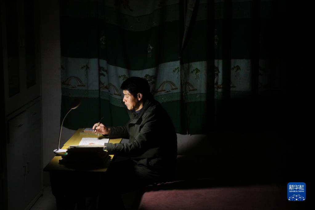 在楠木鄉官溪小學(xué),賴(lài)小田家訪(fǎng)后返回學(xué)校,在宿舍里批改作業(yè)(2月7日攝)。