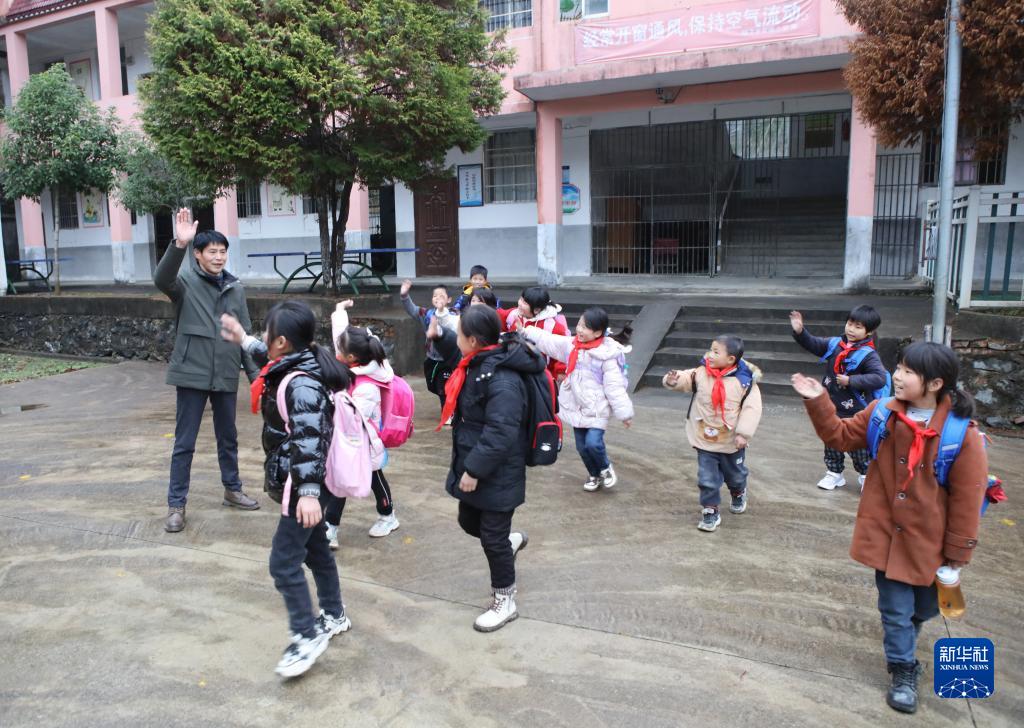 在楠木鄉官溪小學(xué),學(xué)生們放學(xué)后向賴(lài)小田揮手告別(2月7日攝)。