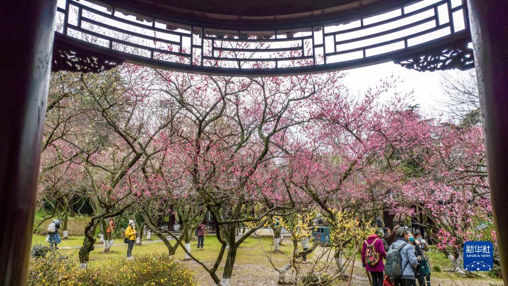 2月10日,游人在南京雨花臺風(fēng)景區觀(guān)賞梅花(無(wú)人機照片)。