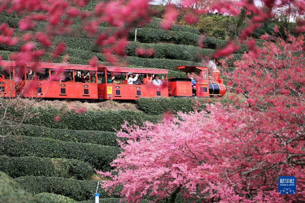 2月11日,游客在福建省漳平市永福鎮櫻花園景區乘坐觀(guān)光小火車(chē)觀(guān)賞櫻花。