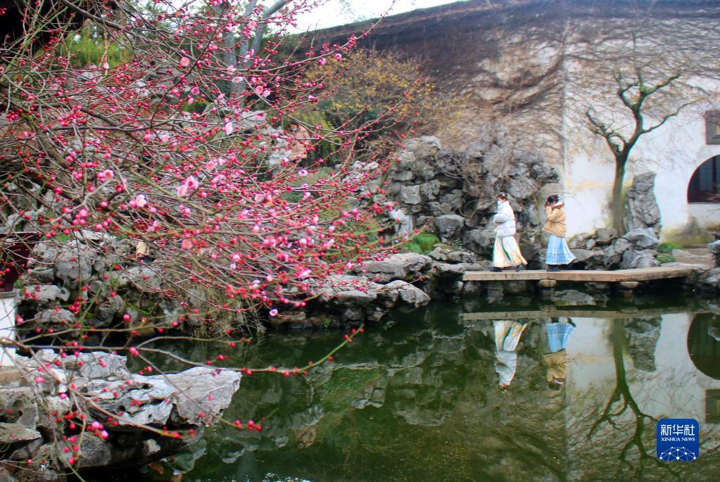 2月10日,游人在江蘇蘇州古典園林藝圃?xún)扔^(guān)景賞梅。