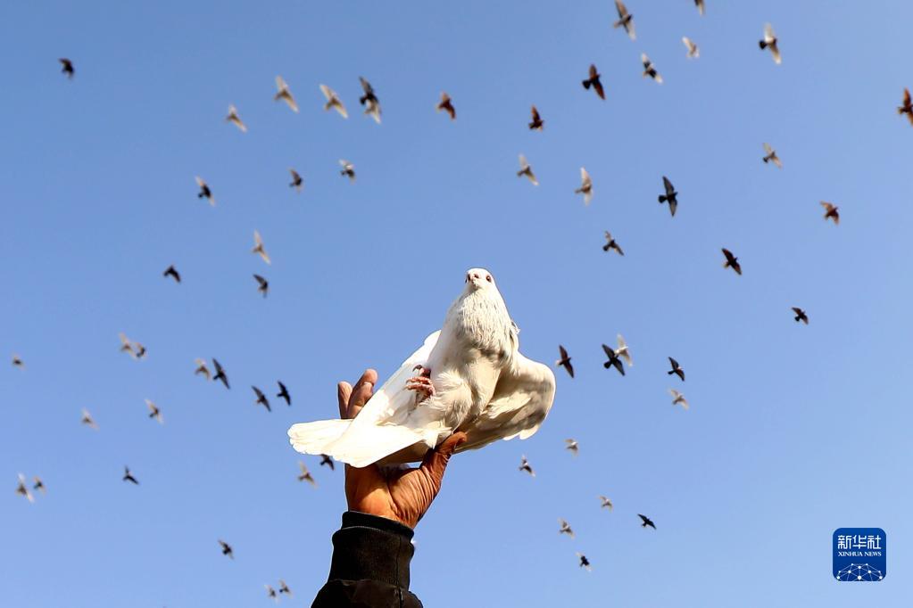 1月29日,在埃及開(kāi)羅,一名養鴿人放飛他的鴿子。