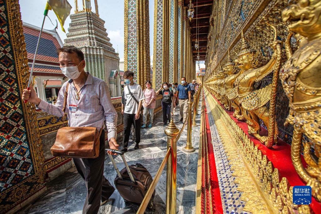 2月7日,中國旅游團游客在泰國曼谷大王宮景區游覽。