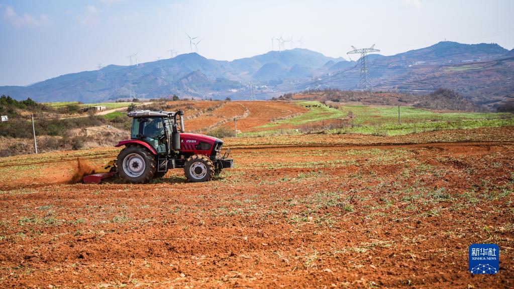 貴州盤(pán)州市勝境街道沙淤村村民駕駛翻耕機在田地里勞作(2月9日攝)。