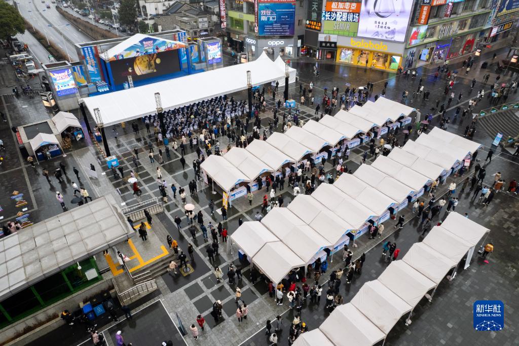 這是位于長(cháng)沙市天心區黃興南路步行街的招聘活動(dòng)現場(chǎng)(2月11日攝,無(wú)人機照片)。