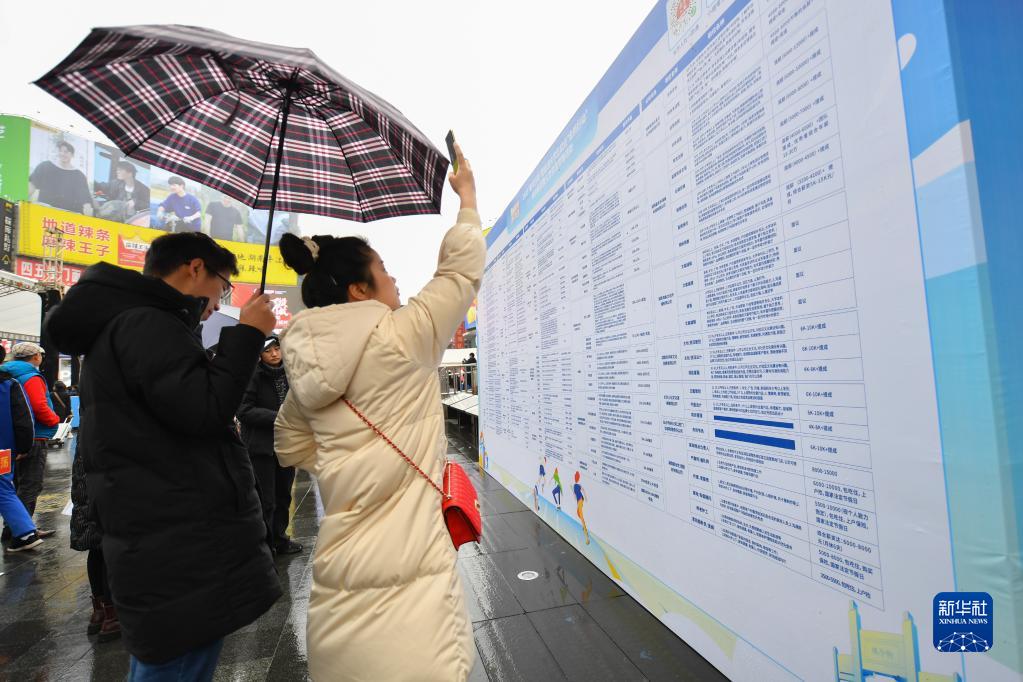 2月11日,在長(cháng)沙市天心區黃興南路步行街,求職者在招聘活動(dòng)現場(chǎng)尋找合適崗位并拍照。