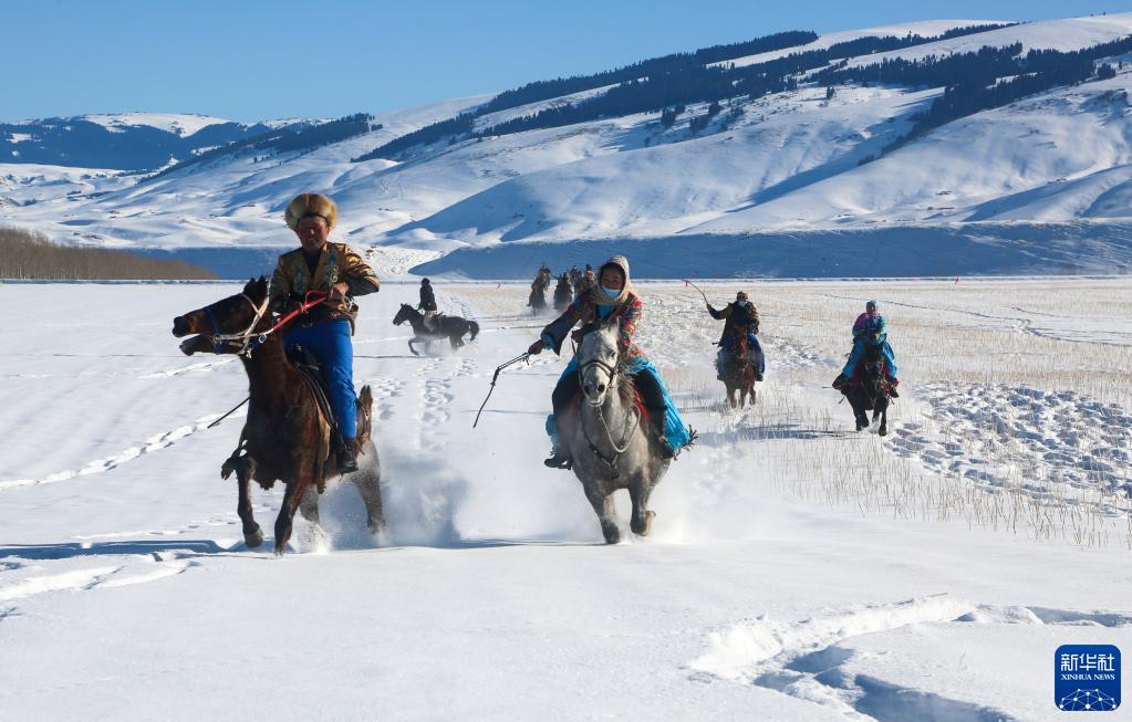在新疆昭蘇縣薩爾闊布鄉一處雪原上,當地農牧民進(jìn)行“姑娘追”活動(dòng)(2022年12月21日攝)?!肮媚镒贰笔枪_克族的傳統馬上體育運動(dòng)。入冬以來(lái),昭蘇縣各族農牧民開(kāi)展豐富多彩的民間文化體育活動(dòng),豐富冬閑時(shí)節生活。新華社發(fā)(李文武 攝)