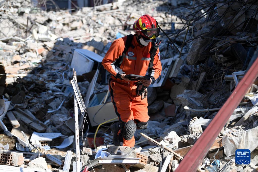2月11日,中國救援隊隊員在土耳其哈塔伊省安塔基亞市一處地震廢墟開(kāi)展救援工作。