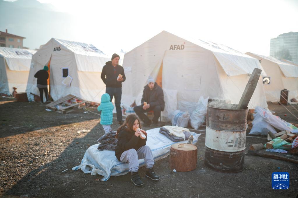 2月11日,在土耳其哈塔伊省安塔基亞市,受地震影響的人們在帳篷外休息。