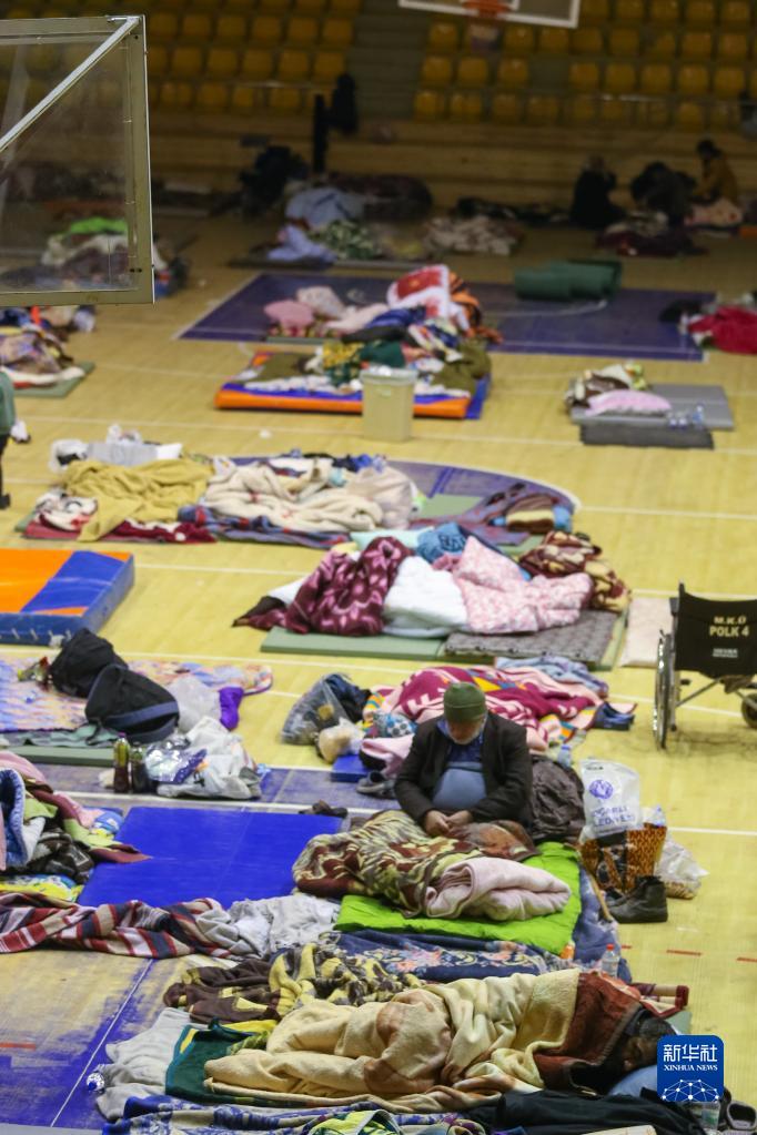 2月11日,受地震影響的人們在土耳其哈塔伊省安塔基亞市的一個(gè)體育館休息。