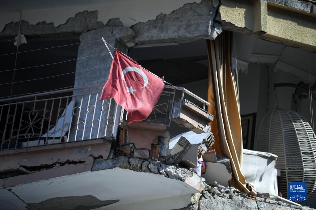 2月11日,在土耳其哈塔伊省安塔基亞市,遭地震損毀的建筑上懸掛著(zhù)土耳其國旗。