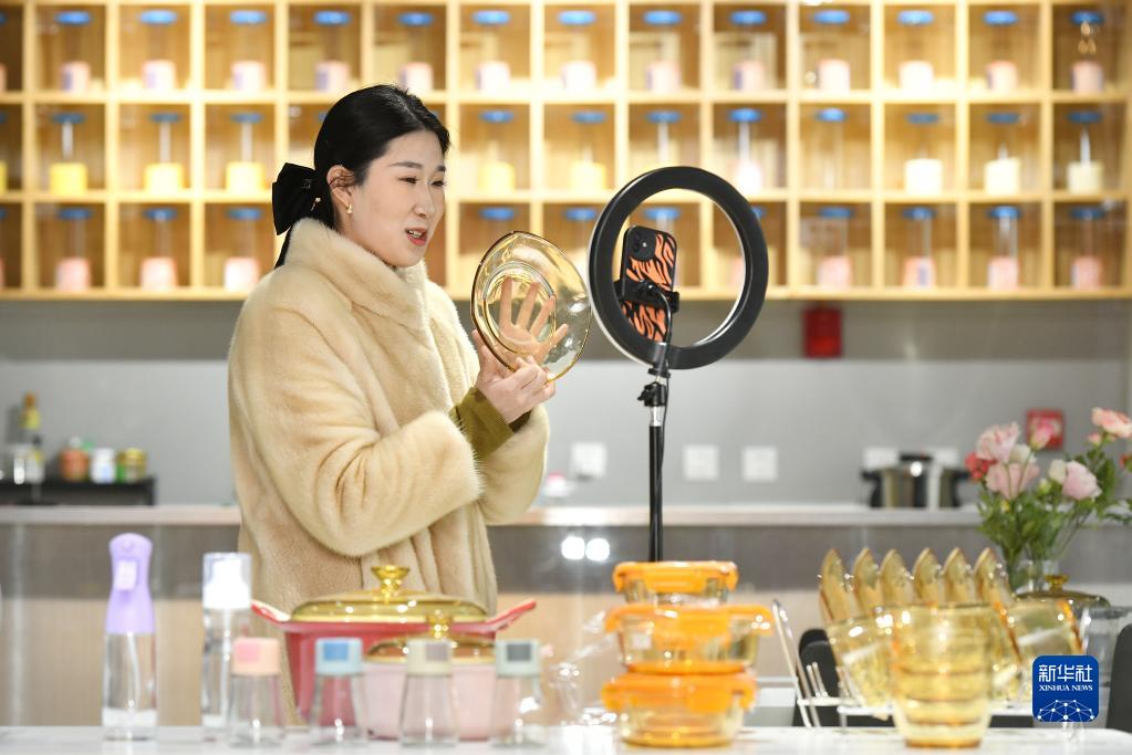 2月11日,河北省河間市一家工藝玻璃制品生產(chǎn)企業(yè)的工作人員在通過(guò)網(wǎng)絡(luò )直播推介產(chǎn)品。