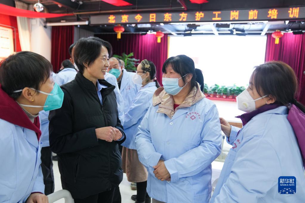 薛四四(右二)在北京市今日東方家政服務(wù)公司的護工崗前培訓上與老師交流(2月4日攝)。