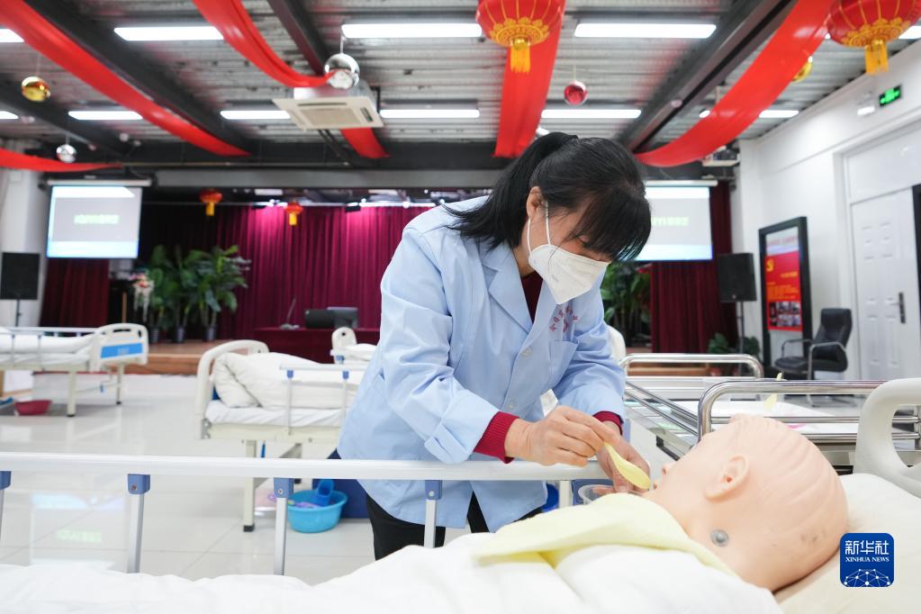 薛四四在北京市今日東方家政服務(wù)公司的護工崗前培訓上練習飲食照護操作(2月8日攝)。