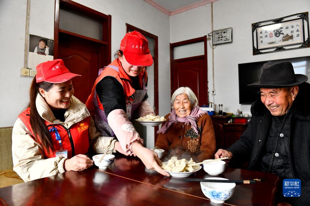 2月12日,在鄆城縣鄆州街道王沙灣村,鄆城縣居家養老服務(wù)中心的工作人員為魏金蘭(右二)、沈宜明(右一)端上餃子。