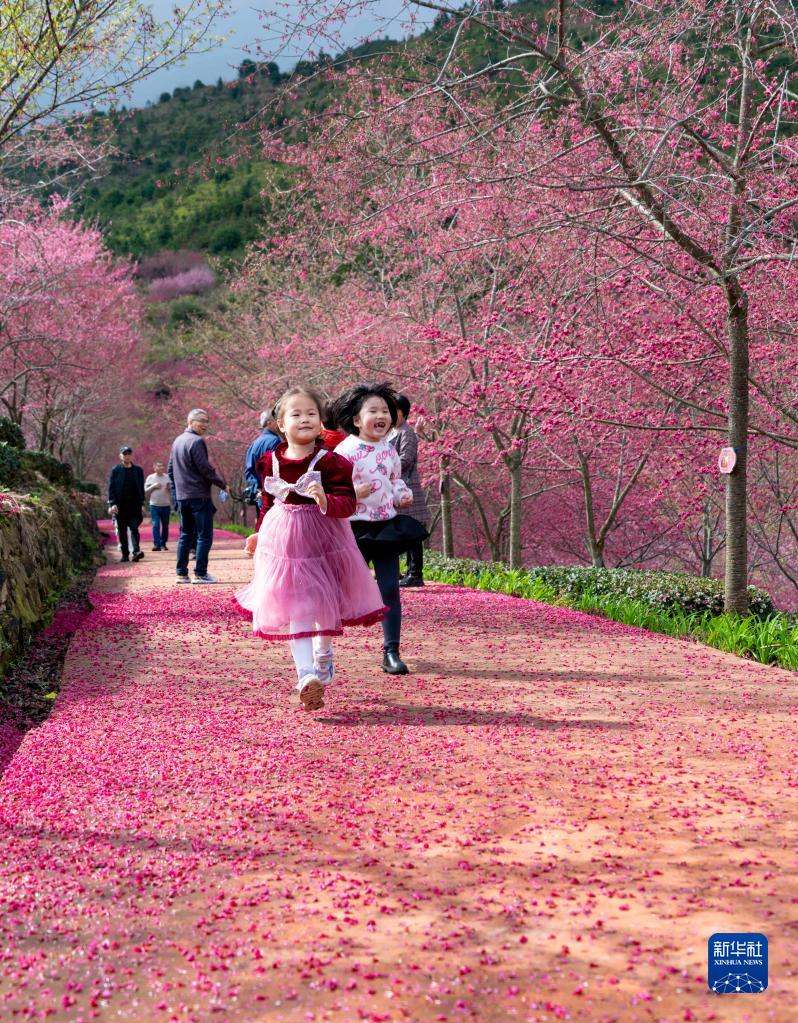 2月12日,福建省南靖土樓景區的紫云山生態(tài)園中,小朋友在櫻花樹(shù)下奔跑嬉戲。