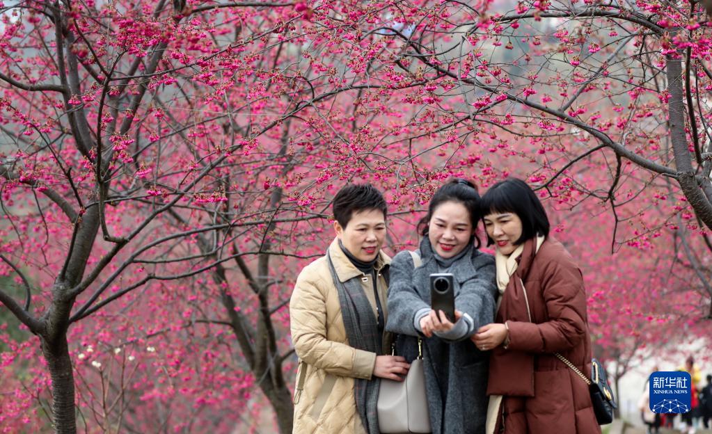 2月12日,游客在四川省瀘州市江陽(yáng)區丹林鎮建設村賞花拍照。