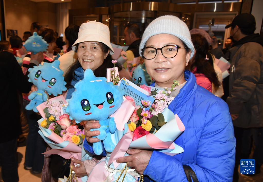 2月12日,來(lái)自香港的游客黃麗深(右)在歡迎儀式上展示收到的鮮花和玩偶。