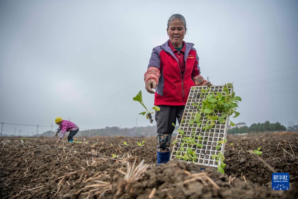 2月12日,在湖南省永州市道縣祥霖鋪鎮上渡村,農民在移栽農作物幼苗。