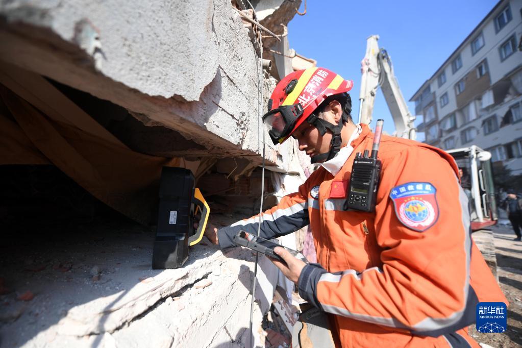 2月12日,中國救援隊隊員在土耳其哈塔伊省安塔基亞市一處地震廢墟開(kāi)展救援工作。