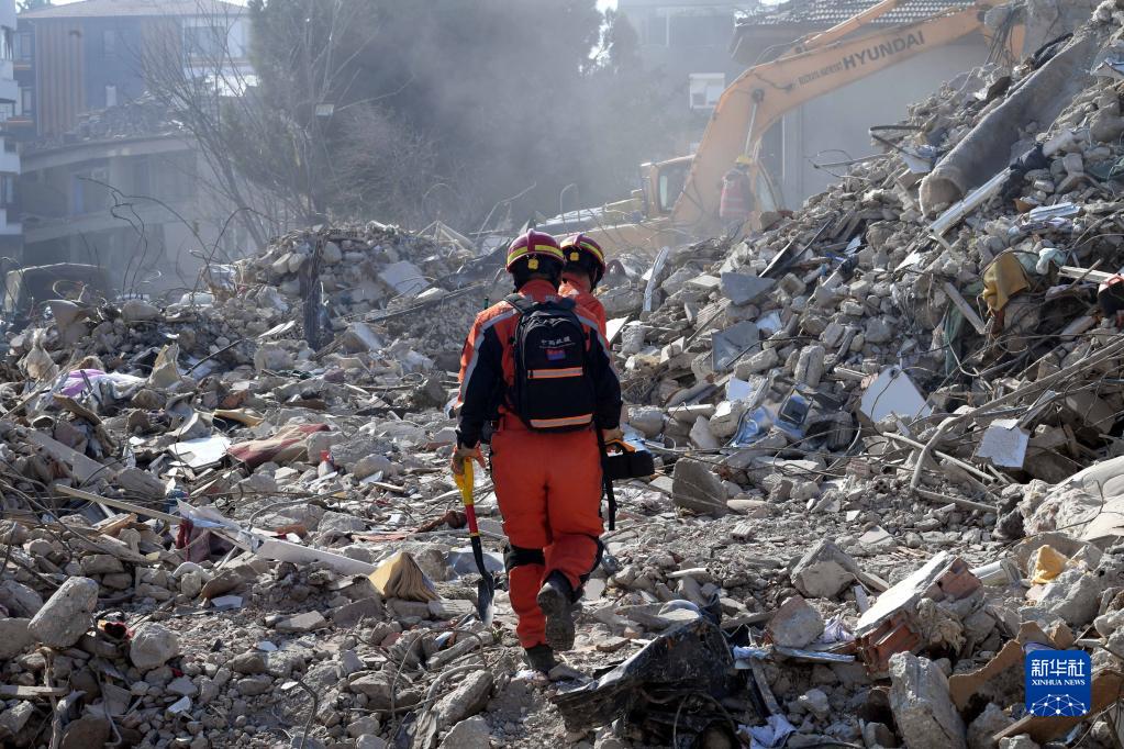 2月12日,中國救援隊隊員在土耳其哈塔伊省安塔基亞市一處地震廢墟開(kāi)展救援工作。