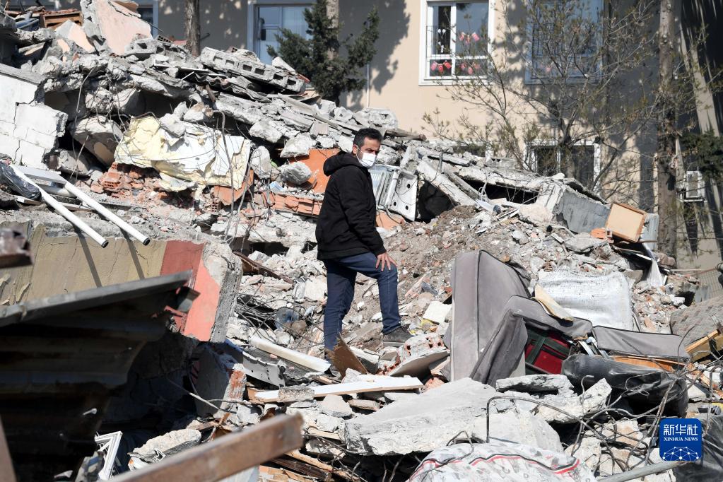 2月12日,一名男子站在土耳其哈塔伊省安塔基亞市一處地震廢墟上。