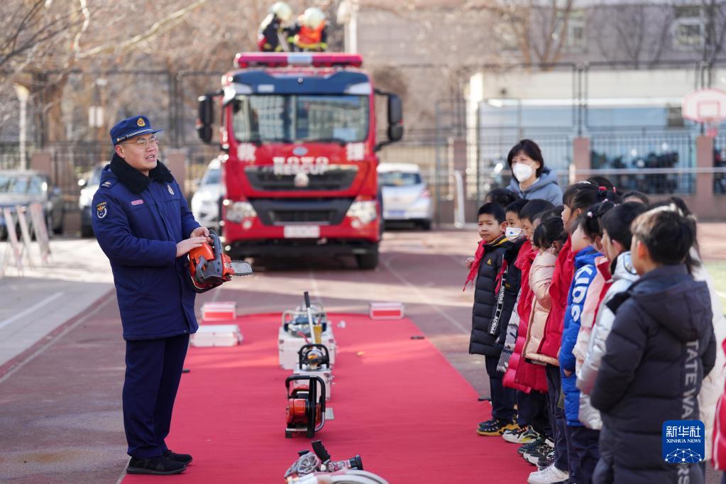 2月13日,在北京市朝陽(yáng)區芳草地國際學(xué)校遠洋小學(xué),北京市朝陽(yáng)區消防救援支隊八里莊消防救援站的消防員(左一)在開(kāi)學(xué)典禮后為同學(xué)們講解消防知識。