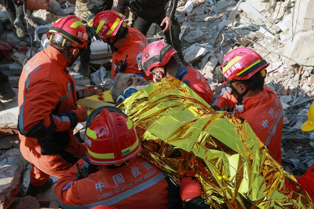 2月12日,在土耳其哈塔伊省安塔基亞市,中土兩國救援隊隊員轉移一名救出的幸存者。