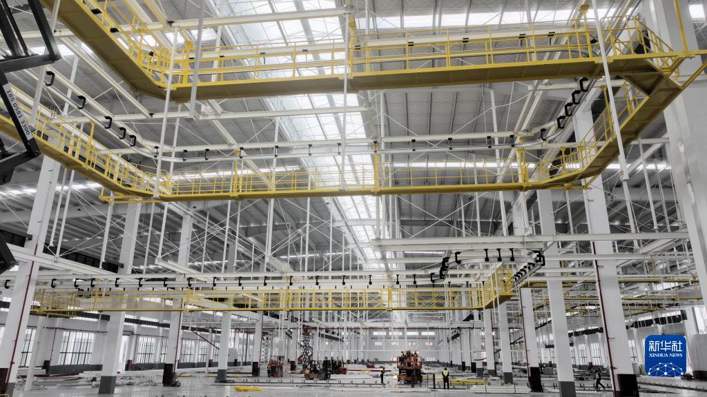 2月12日,德清縣雷甸鎮一家高空作業(yè)機械生產(chǎn)企業(yè)“未來(lái)工廠(chǎng)”車(chē)間,工人在安裝智能化生產(chǎn)線(xiàn)設備(無(wú)人機照片)。