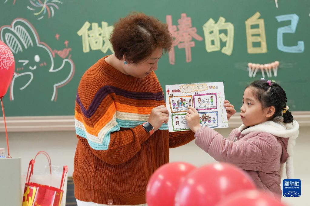 2月13日,在北京市朝陽(yáng)區芳草地國際學(xué)校遠洋小學(xué),一年級三班的學(xué)生郭宜之(右)在展示寒假作業(yè)。