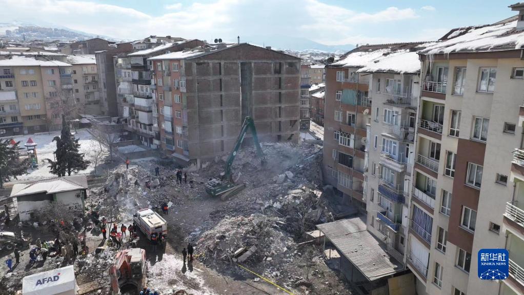 2月13日,在土耳其馬拉蒂亞,中國藍天救援隊隊員與當地救援人員在一處廢墟合作開(kāi)展地震救援工作。