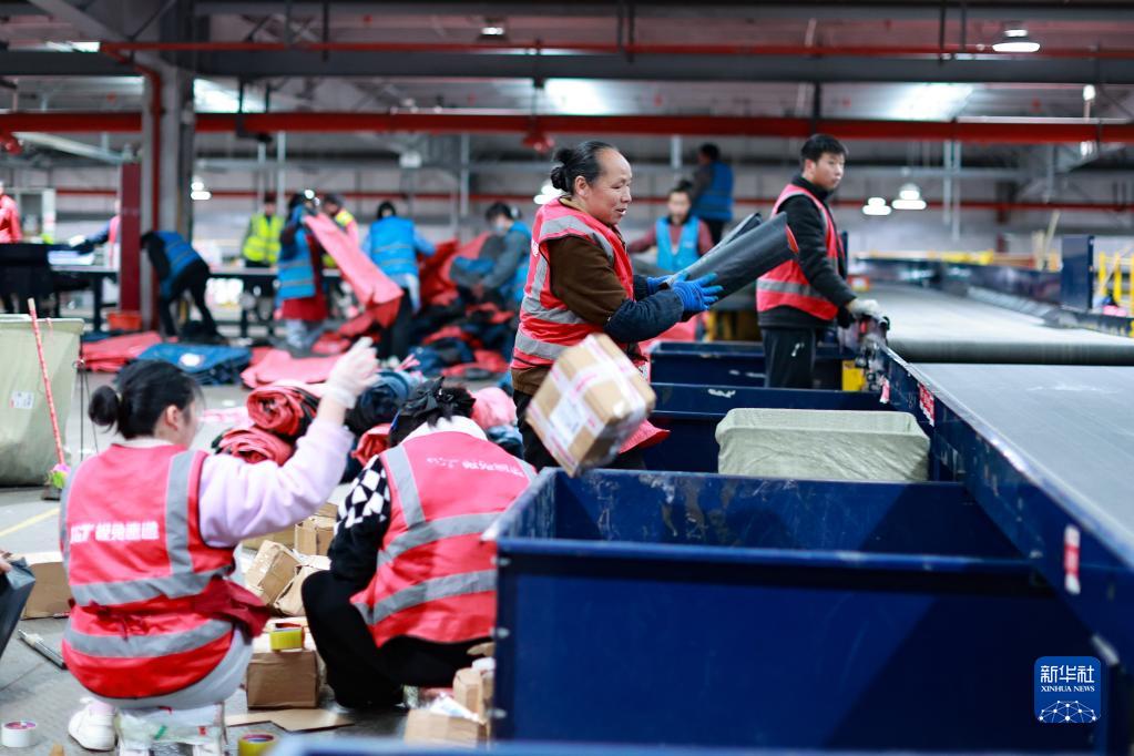 2月13日,工作人員正在貴州快遞物流園內分揀快遞。